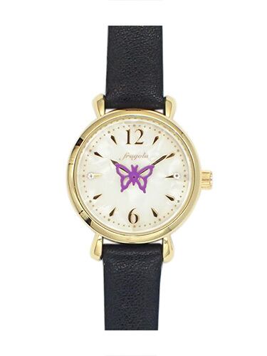 1秒ごとに回転する蝶々の秒針がポイントのフェミニンな腕時計です。