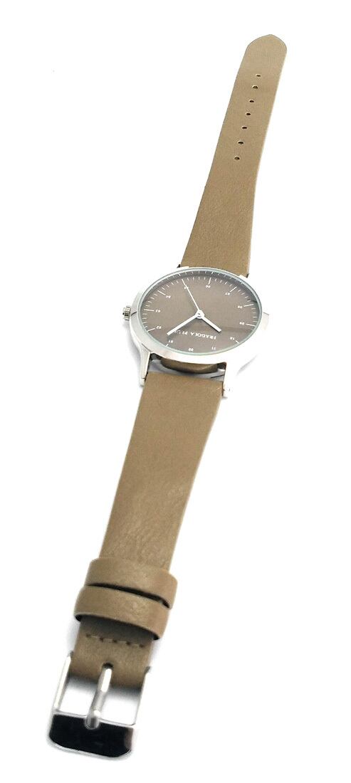 文字盤と時計ベルトが同色の腕時計。